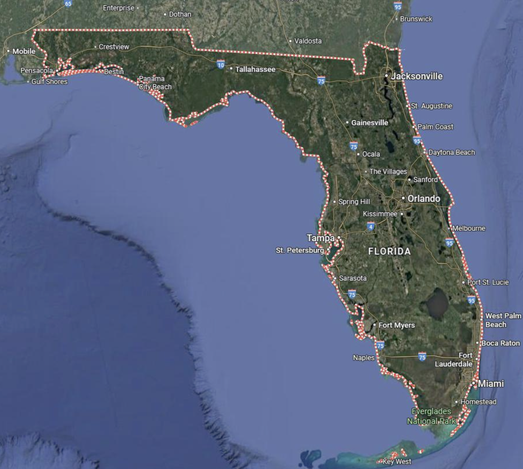 (Florida State boundary – North/West and includes Keys)
